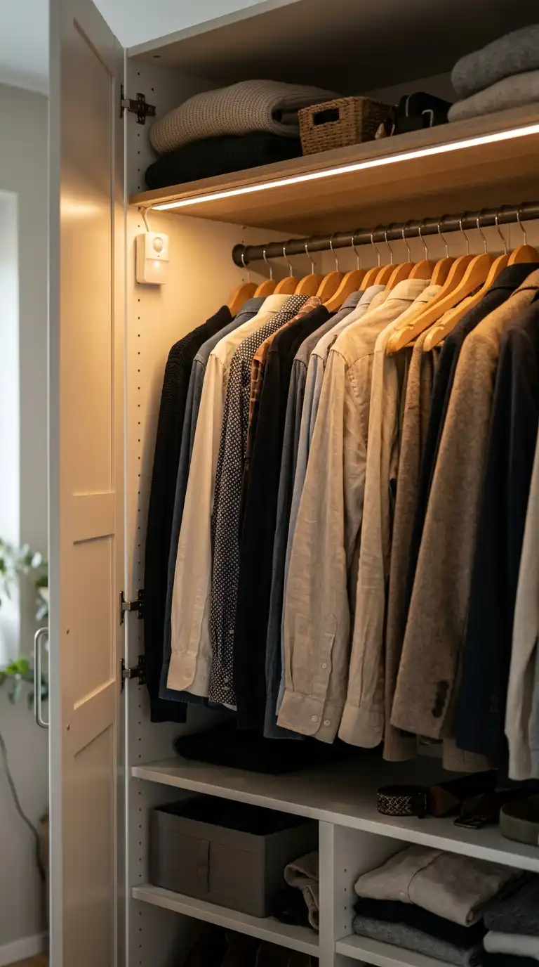 Internal lighting instantly elevates a PAX wardrobe from utilitarian to luxurious. Motion-sensor LED lights turn on automatically when you open the doors, adding convenience and ambiance. Warm-white adhesive LED strips (2700K–3000K) are ideal for a cozy glow. For renters, battery-powered puck lights offer a no-wiring solution that takes minutes to install. Place lights along the top edge of the wardrobe, on shelves, or inside drawers to illuminate the contents and make selecting items easier, especially in darker rooms.