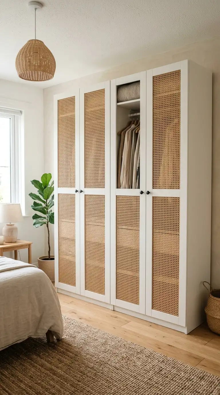 For a touch of natural texture and boho charm, cut out sections of your PAX doors and fill them with cane or rattan webbing. Use a jigsaw to create the openings, then attach the webbing with a staple gun. This hack works beautifully on wardrobe doors, adding warmth and a handcrafted feel that softens the overall look of the space. Cane webbing is available in various patterns and can be stained or left natural. This technique is perfect for bohemian, coastal, and eclectic interiors.
