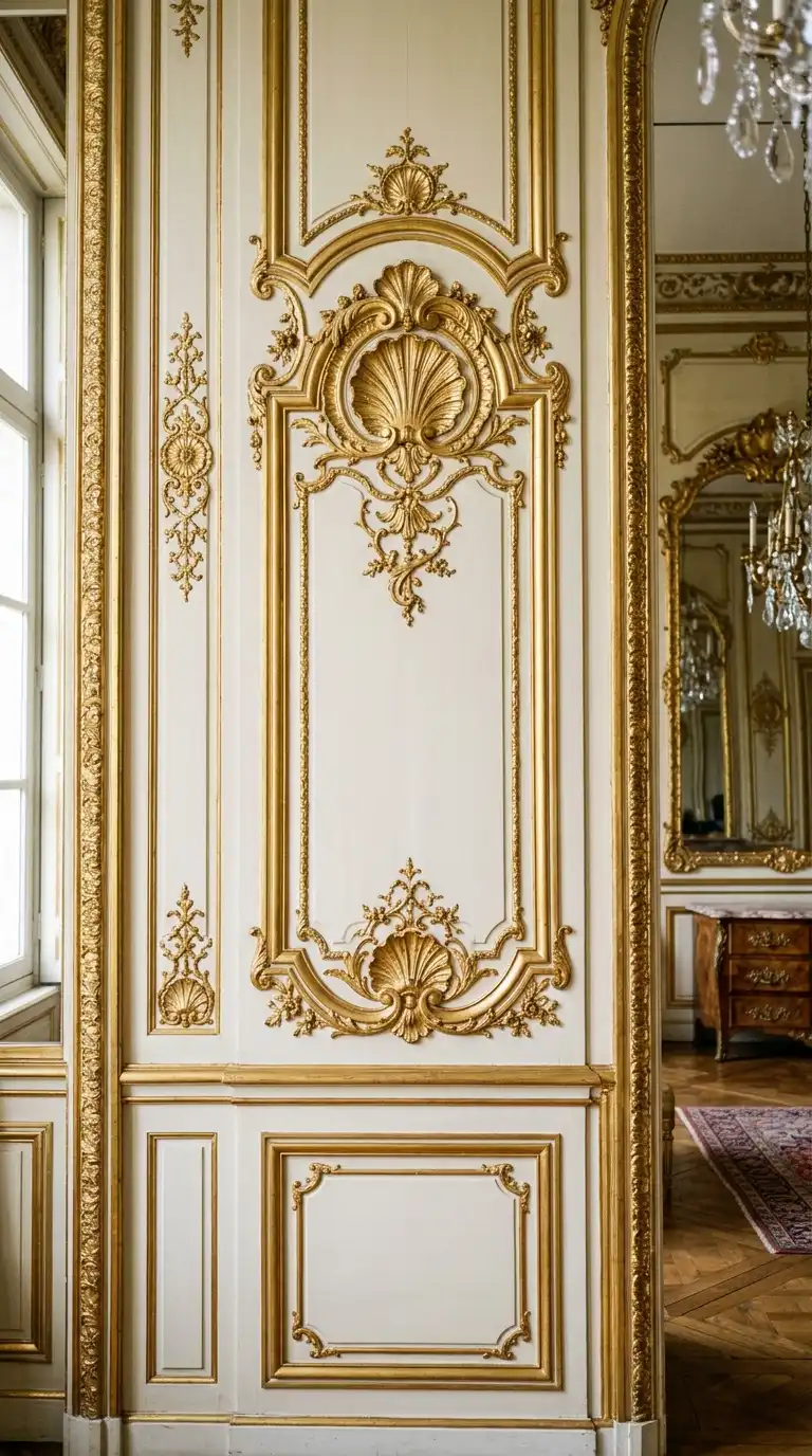 Boiserie is carved wooden panelling on walls. The panels are decorated with shells, scrolls, and flowers. The wood is painted white or pastel. The carvings are gilded. Boiserie is panelled, carved, and gilded.