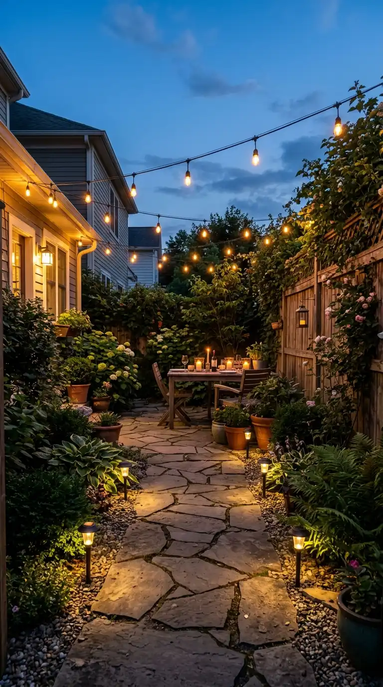 Lighting transforms a small backyard into a magical evening retreat. Use string lights to create a warm canopy overhead. Add path lights to guide movement and define edges. Place candles or lanterns on tables for soft, flickering light. Layered lighting adds depth, drama, and a sense of enchantment, making your small space feel larger and more inviting.