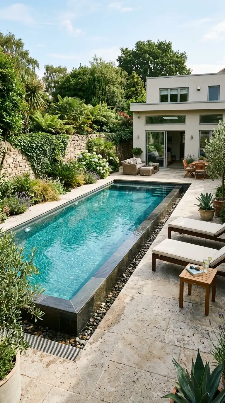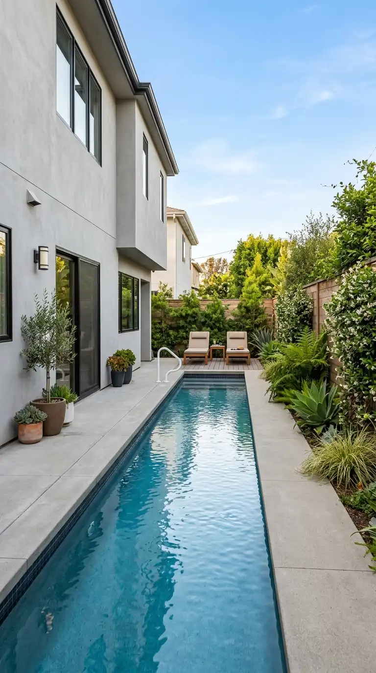 A narrow, rectangular lap pool is designed for swimming laps in a straight line. Its slim profile allows it to fit along the side of a house, against a fence, or in a narrow backyard where a wider pool wouldn’t be feasible. Lap pools are typically 2.5 to 3 meters wide and 10 to 15 meters long, making them ideal for fitness enthusiasts with limited space.