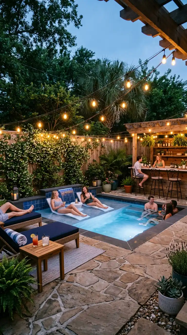 A cocktail pool is a small, shallow pool designed for lounging, socializing, and cooling off rather than swimming. Often featuring built-in seating, sun shelves, or tanning ledges, cocktail pools are perfect for small backyards where entertaining is the priority. Add a built-in bar or counter near the pool to create a true cocktail-party atmosphere.