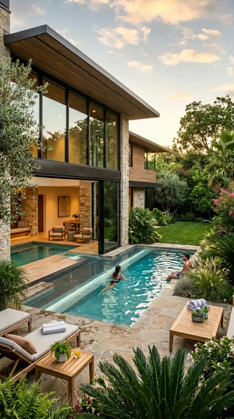 For a truly unique small backyard solution, consider an indoor-outdoor pool that extends from the interior of your home to the exterior. A glass wall or sliding door separates the indoor and outdoor sections, allowing you to swim from inside to outside. This design is ideal for climate control, year-round use, and creating a seamless connection between your home and garden.