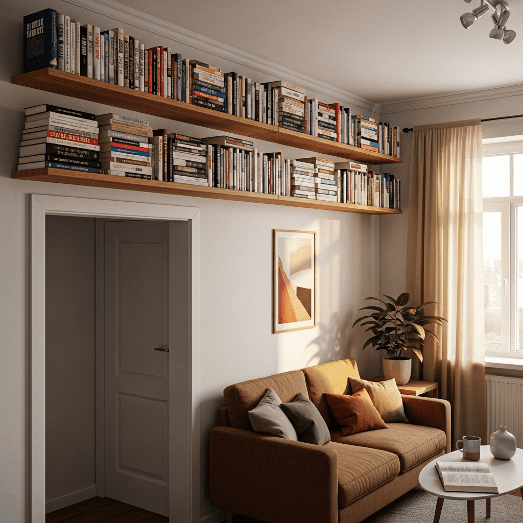Install a single long shelf above the doorway or the TV. It’s “found” space that provides a home for books or baskets while keeping the main walls feeling less crowded.