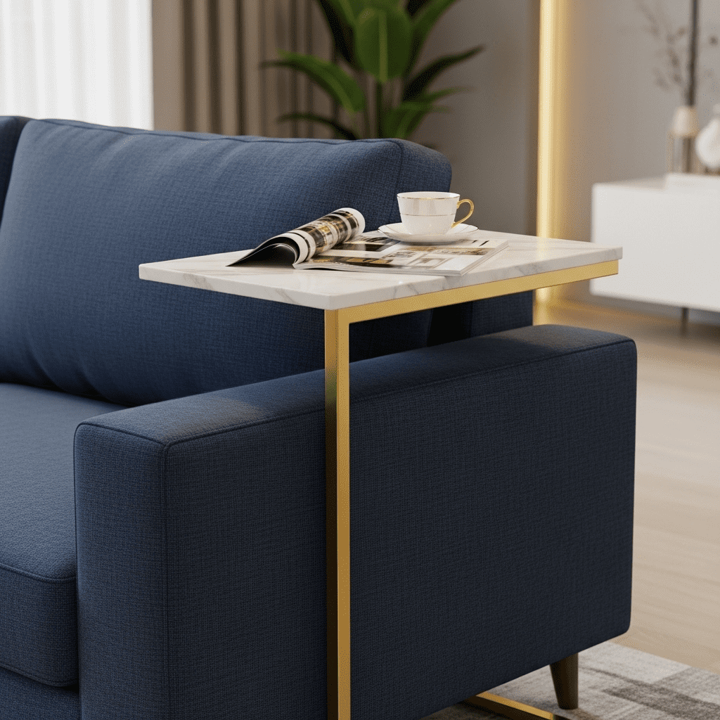 Replace bulky end tables with C-shaped tables that slide their base under the sofa. They provide a surface for your laptop or coffee without taking up extra floor real estate.