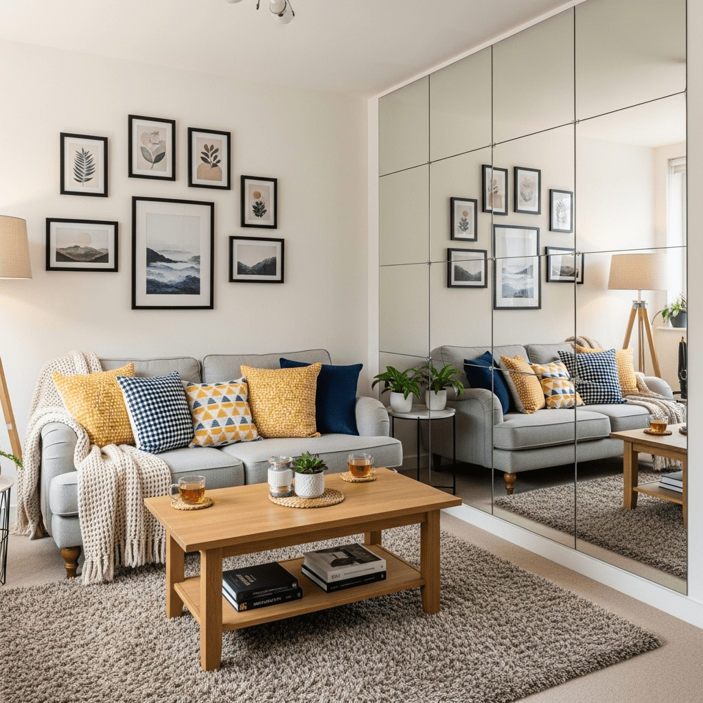 Covering one entire wall with mirrored panels or a series of large mirrors. In an apartment, this effectively “doubles” the floor plan and reflects light into deeper, darker corners.