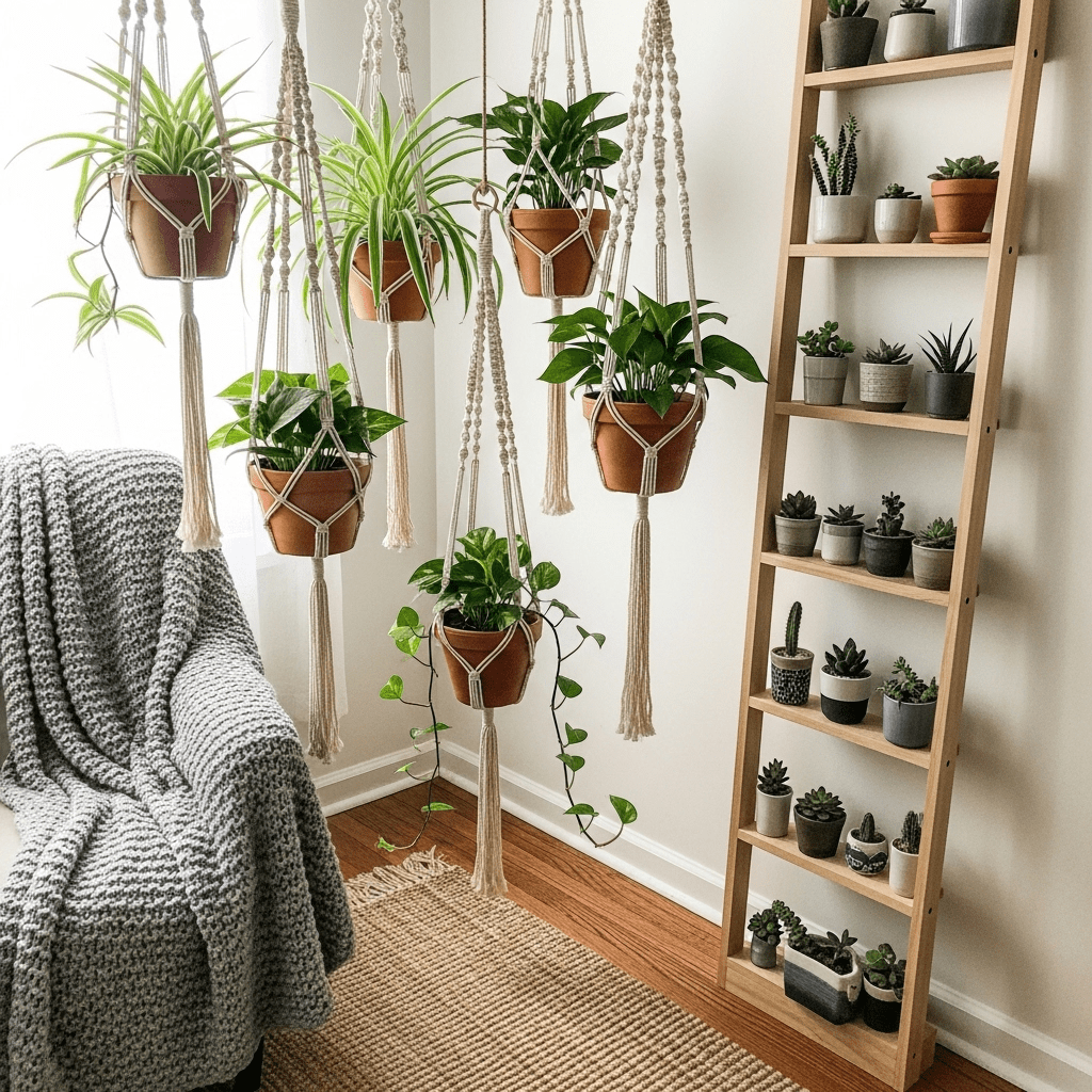 Save floor space by using a tension pole planter or hanging pots from the ceiling. Greenery adds life and “breathability” to a small apartment without occupying a corner.