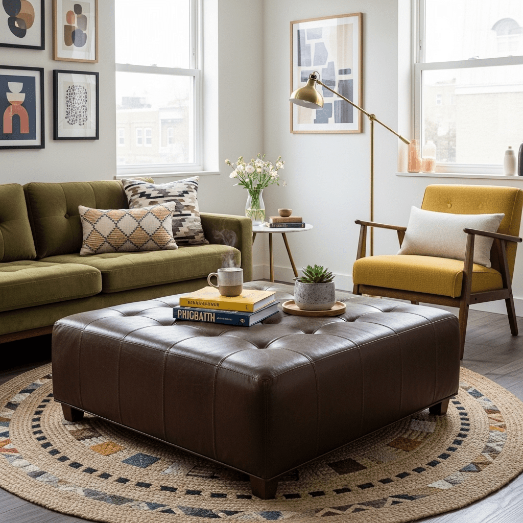 Use a firm, oversized ottoman as your coffee table. It provides a soft surface for your feet, a hard surface for a tray of drinks, and extra seating when guests visit.