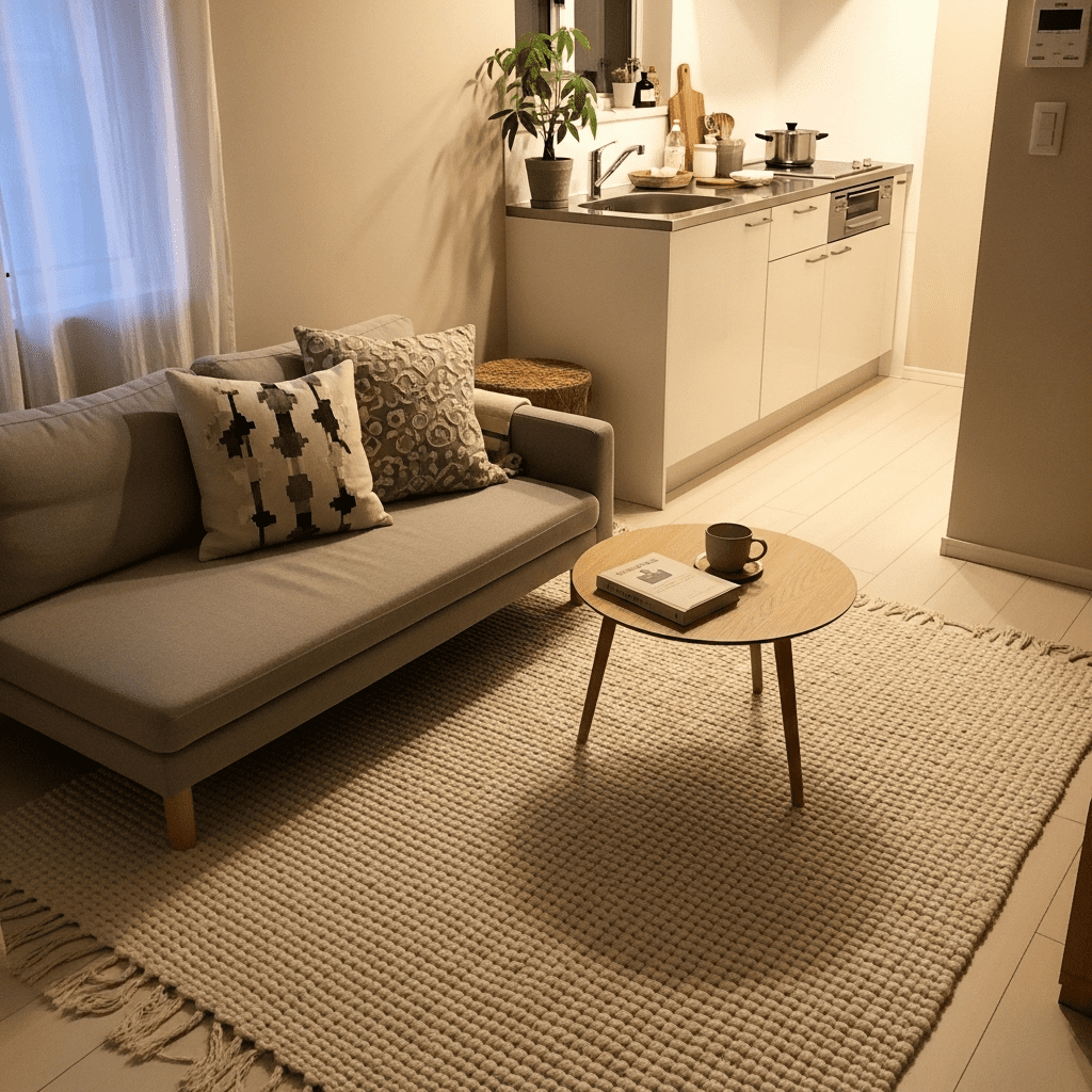 Even in a tiny studio, a large rug can “zone” the living area. Ensure the rug is big enough for all the furniture legs to sit on it, which creates a defined, cozy room-within-a-room.