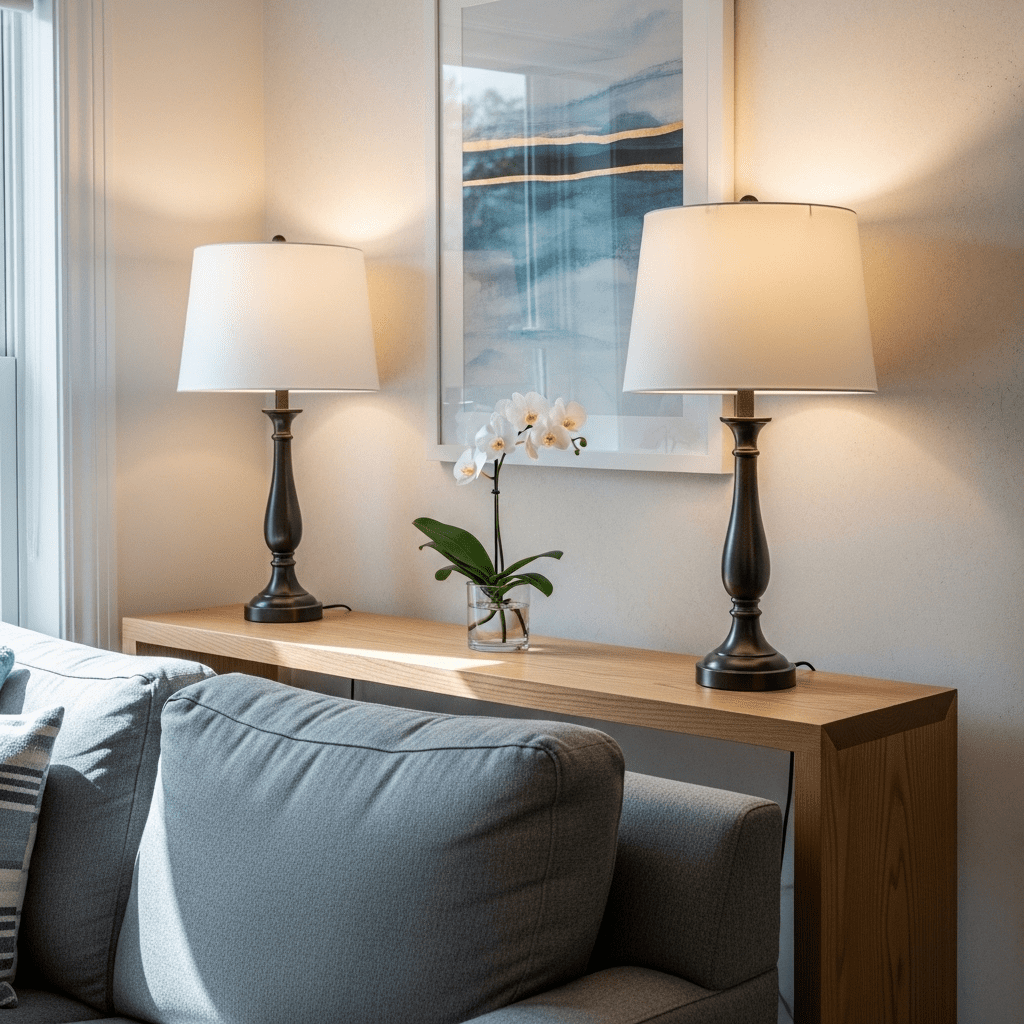 If your sofa isn’t against a wall, place a very thin console table behind it. It’s a perfect spot for lamps and decor, freeing up the need for side tables.