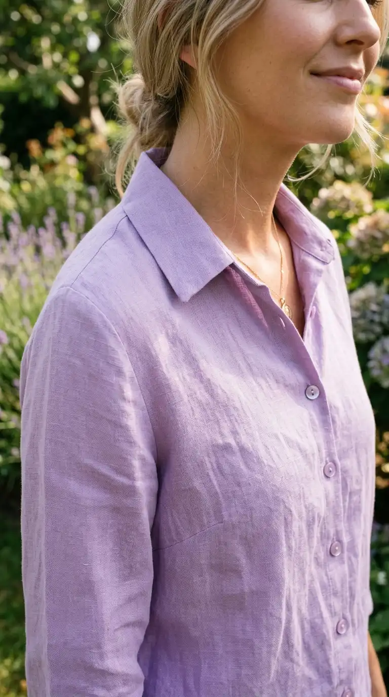 A lavender linen blouse adds a touch of romance to the capsule. The light, breathable fabric is perfect for warmer days, and the soft purple hue complements other soft summer colors. Wear it tucked into trousers or loose over jeans.