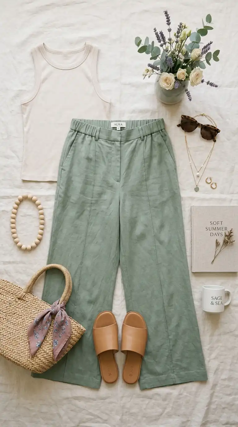 Sage green wide-leg trousers add a modern, elegant silhouette. The muted green is calming and versatile, pairing with dusty rose, lavender, and gray. Choose a high-waisted style for a flattering fit.