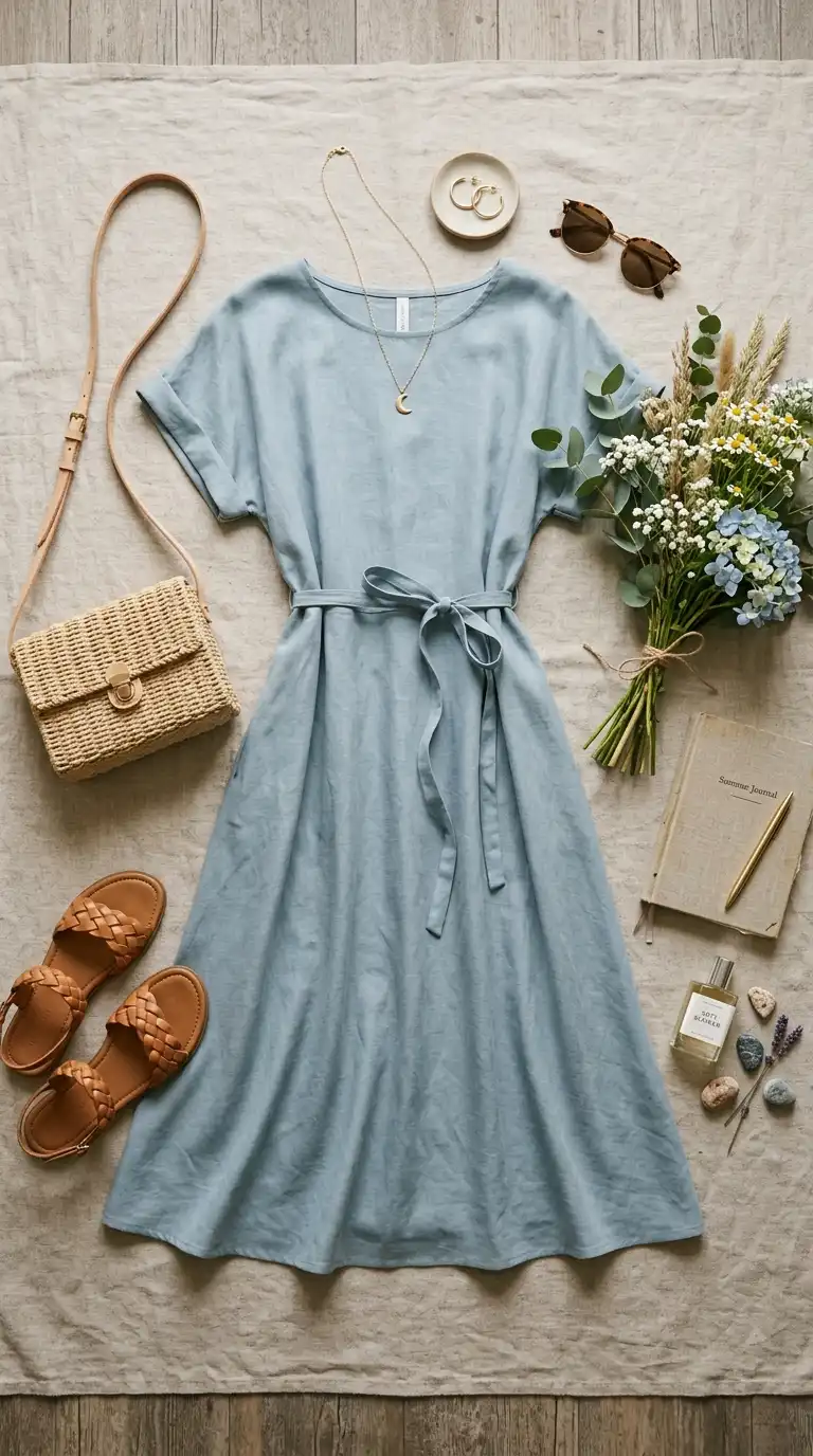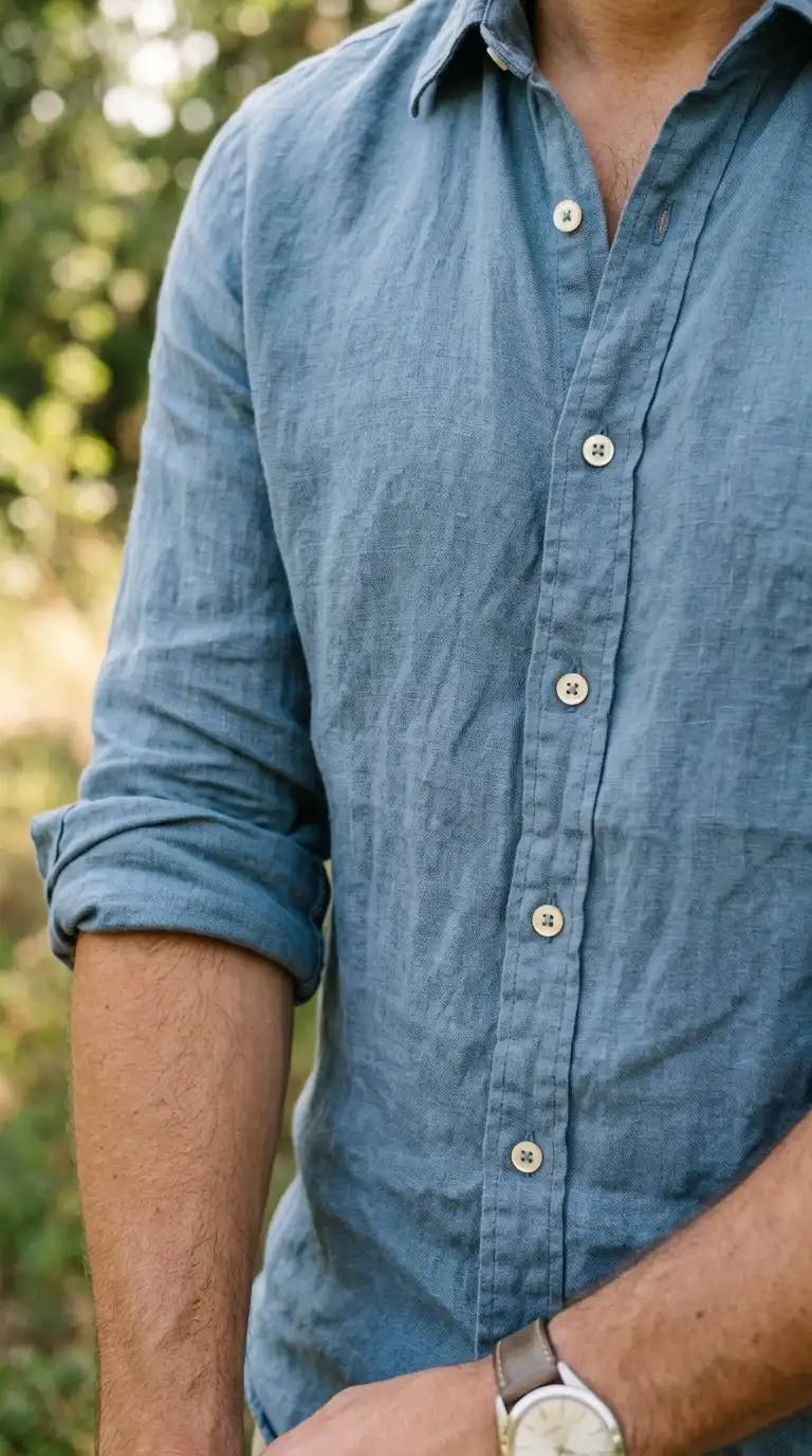 A dusty blue linen button-down shirt adds a relaxed, textured element. The soft blue is calming and versatile, and the linen fabric is perfect for warm weather. Wear it open over a tank or tucked into trousers.