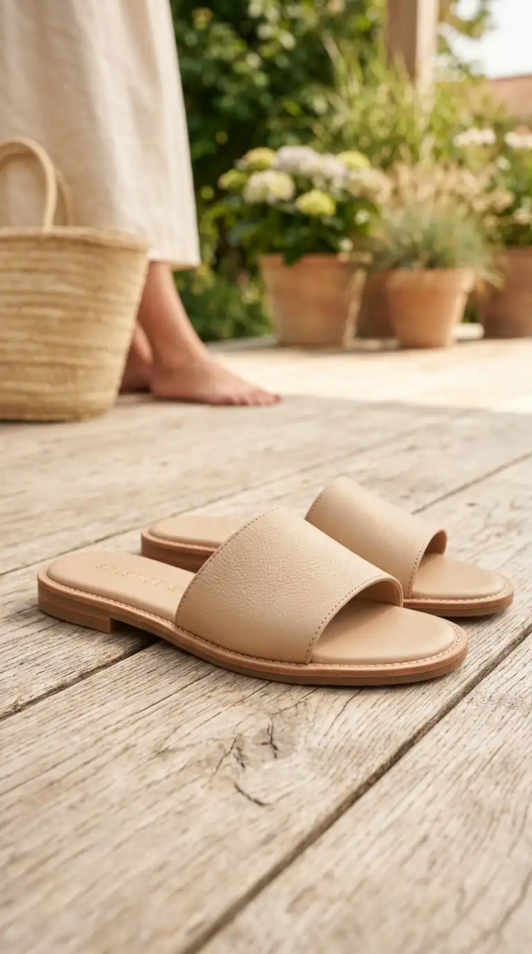 Beige leather sandals add a neutral, polished touch to summer outfits. Choose a classic style with a comfortable footbed. The beige complements the soft summer palette and pairs with dresses, trousers, and skirts.