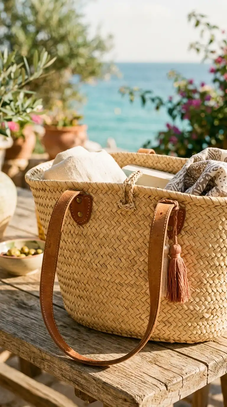 A woven tote bag in natural straw or rattan adds texture and a relaxed summer feel. The neutral material complements the soft color palette and is perfect for everyday use.