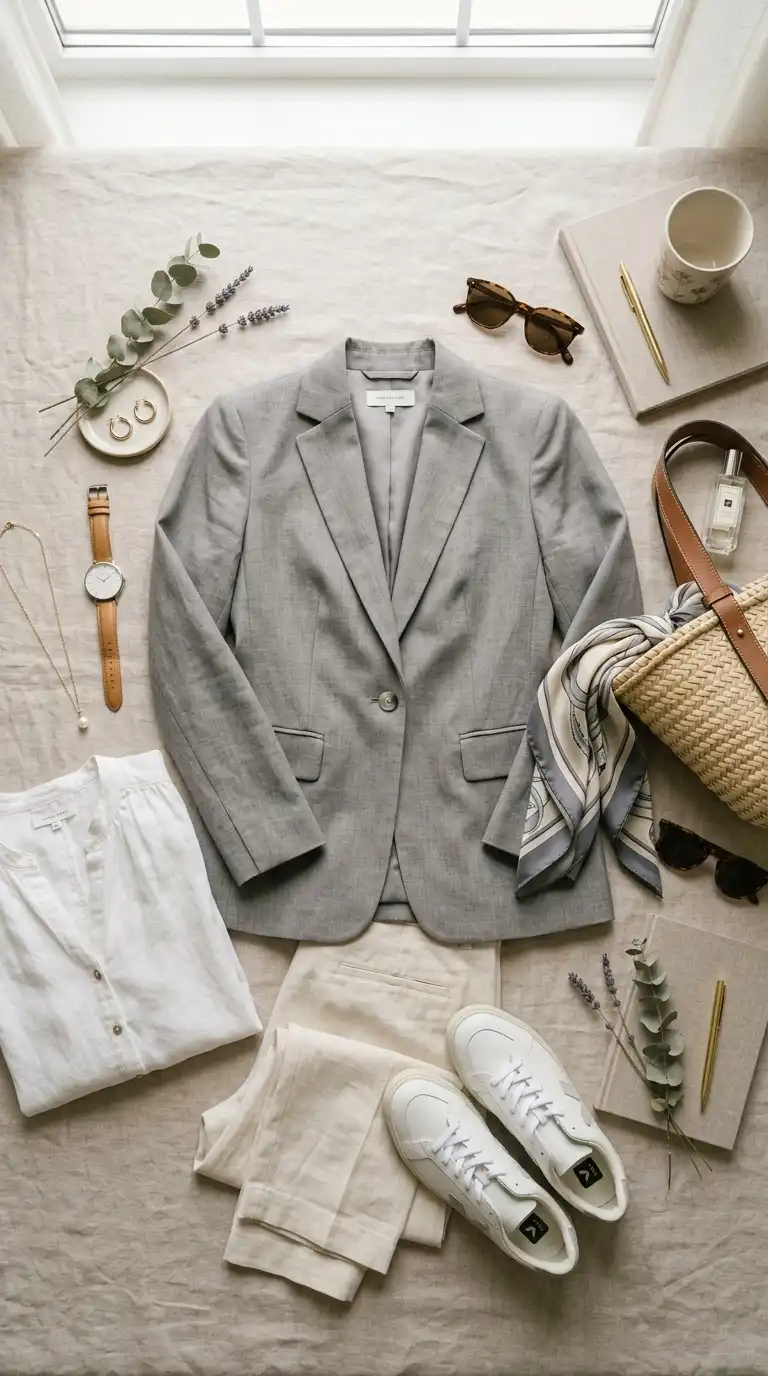 A soft gray tailored blazer adds polish and structure. The neutral gray complements all the soft summer shades and can be worn with trousers, skirts, or jeans. Choose a lightweight fabric for year-round wear.