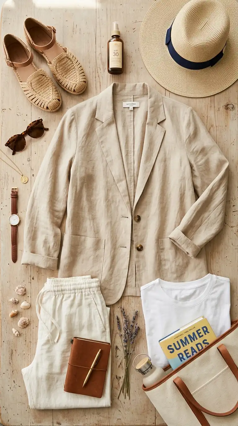 A lightweight linen blazer adds polish to summer outfits without overheating. Wear it over a sundress for evenings out or with shorts and a t-shirt for a smart-casual look. Choose a neutral color like beige, navy, or white.