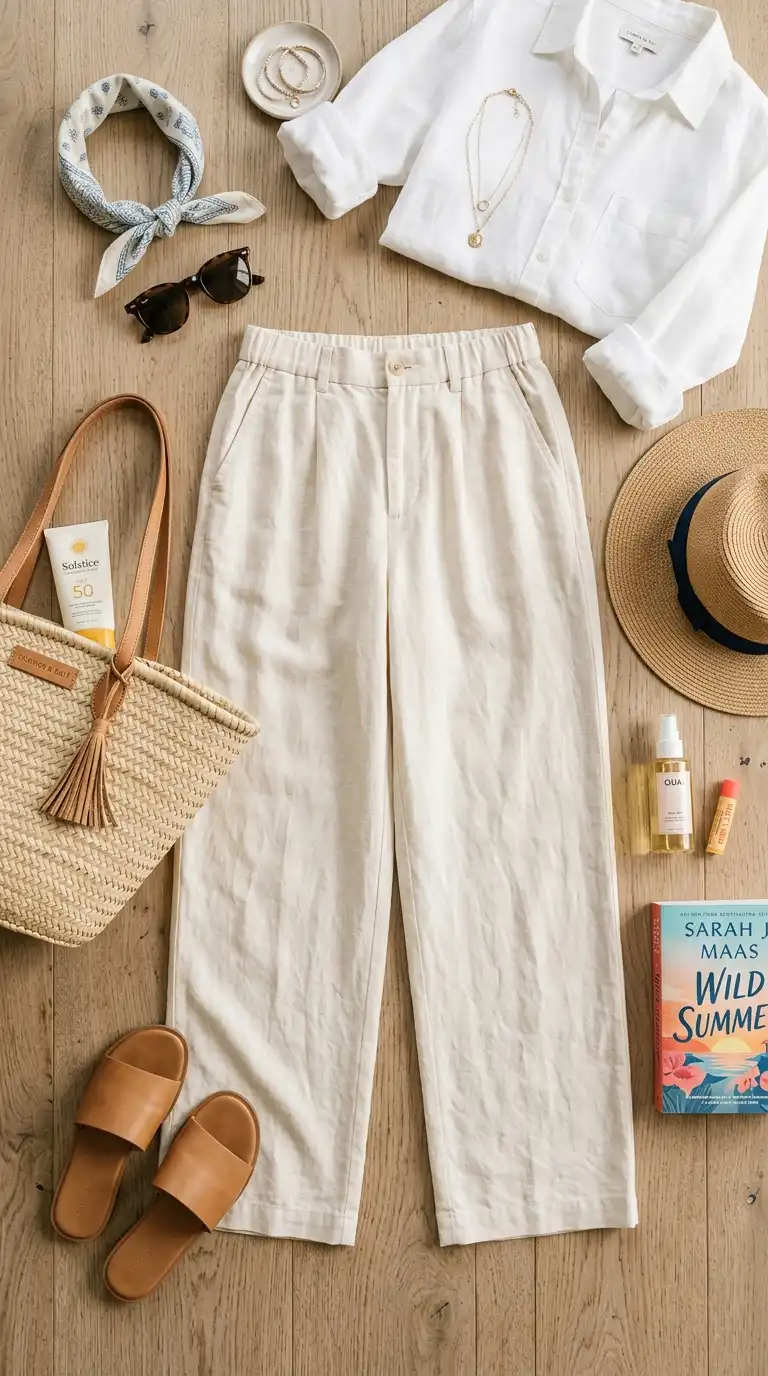 Wide-leg linen trousers offer a chic alternative to shorts or jeans. The loose, flowing silhouette keeps you cool, while the tailored look works for casual offices, brunch, or travel. Choose a neutral color like cream, beige, or olive.