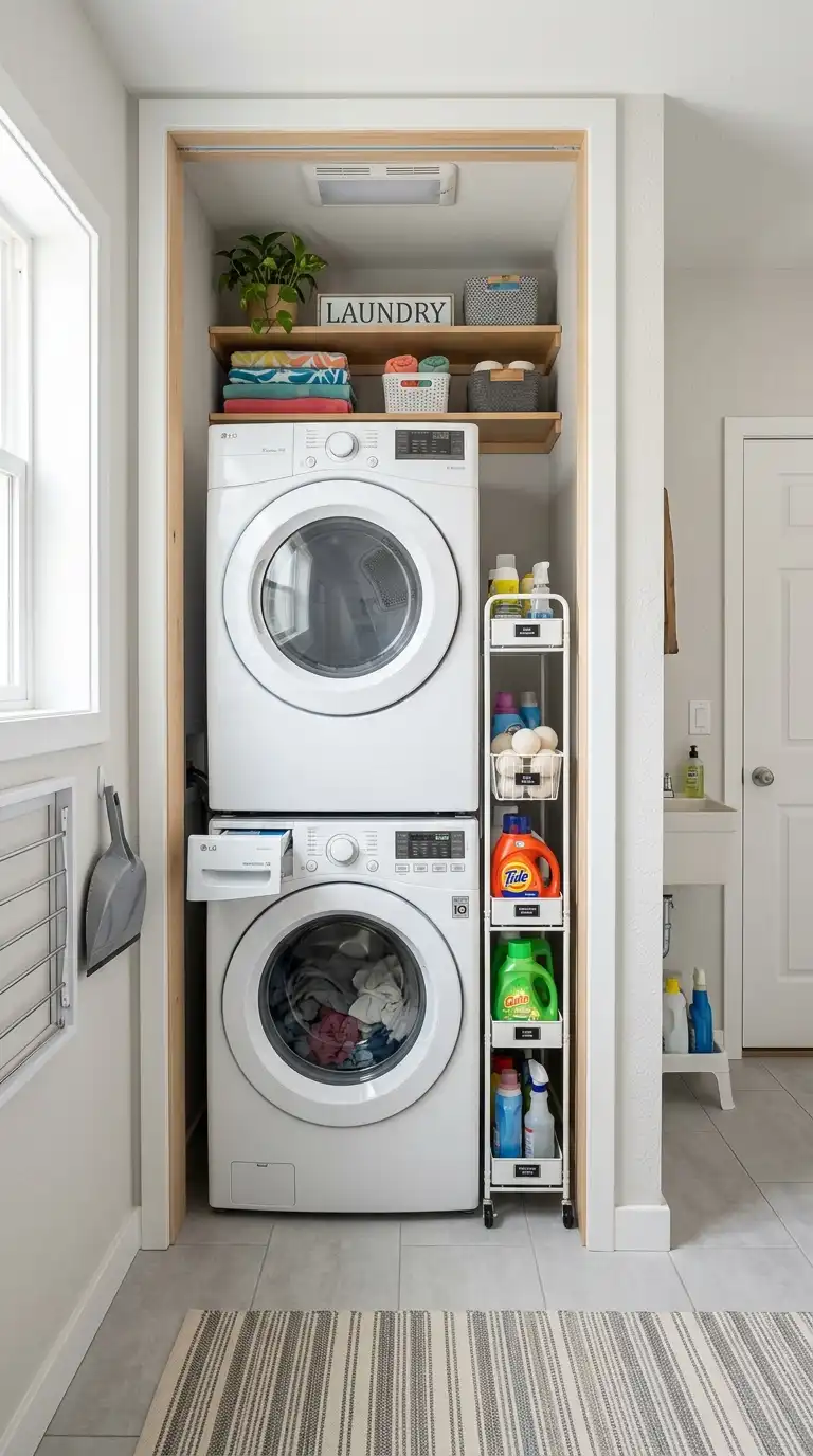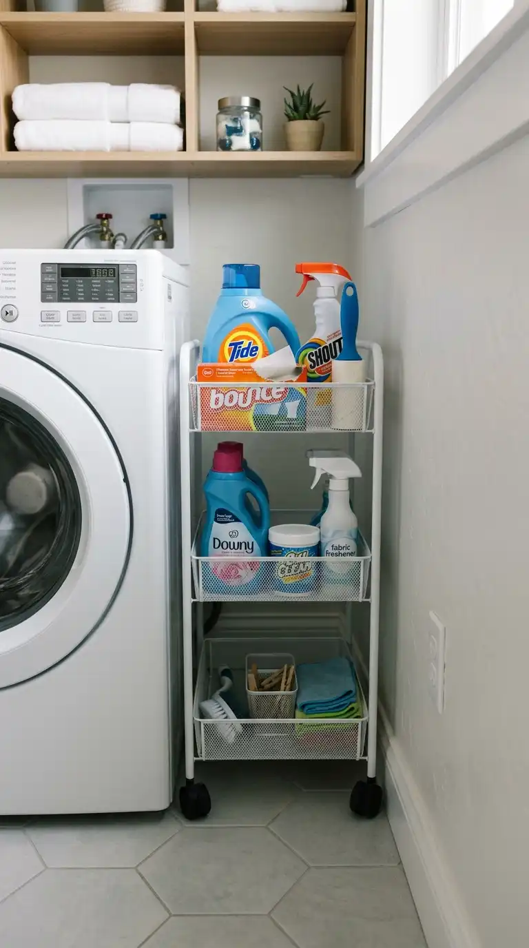 A narrow rolling cart can fit into the tightest spaces. Slide one between the washer and dryer, beside the machines, or under a counter. Use the cart to hold detergent, dryer sheets, stain removers, and other supplies. Choose a cart with locking wheels for stability and multiple tiers for extra storage. A cart can be pulled out for easy access and pushed back when not needed.