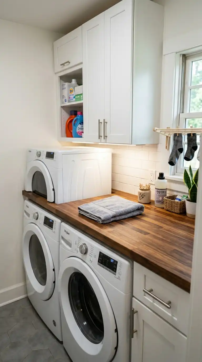 A countertop over your front-loading washer and dryer creates a much-needed folding station without taking up additional floor space. Use butcher block, laminate, or quartz for the surface. Ensure there is enough clearance to open the machine doors fully. Use the space above for wall cabinets or open shelving to keep supplies within easy reach.