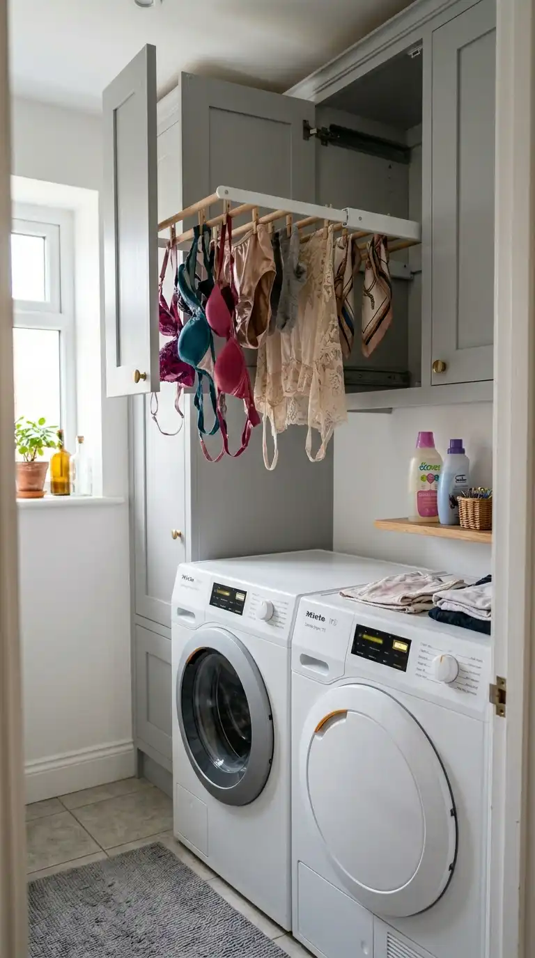 A pull-out drying rack is a space-saving solution for air-drying delicates. Install the rack above the washer and dryer or inside a tall, narrow cabinet. When not in use, it slides away completely. For even tighter spaces, consider a retractable clothesline mounted on the wall or an over-the-door drying rack that folds flat.