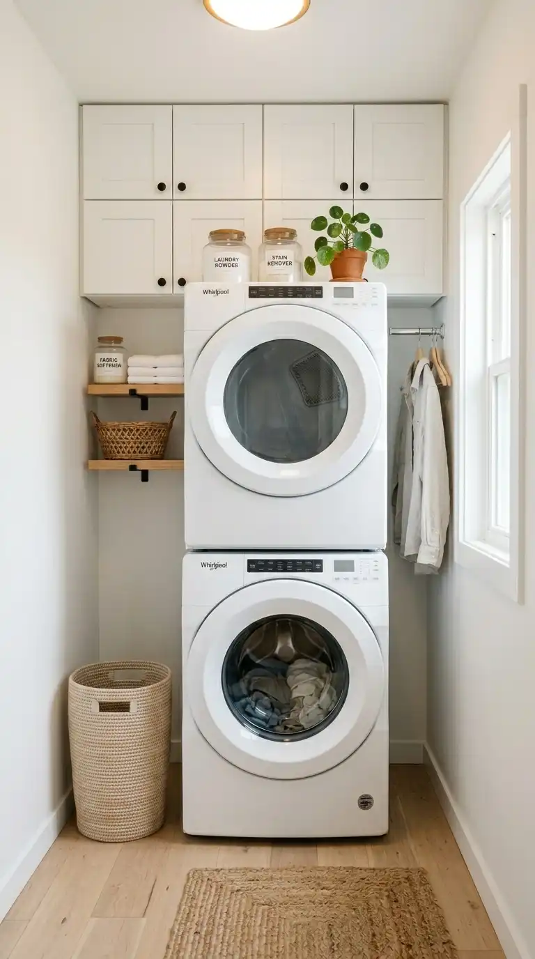 Stacking your washer and dryer is the most effective way to save floor space in a tiny laundry room. Use a stacking kit to place the dryer on top of a front-loading washer. This frees up valuable floor space for a narrow cabinet, a rolling cart, or a small folding area. If your current machines cannot be stacked, consider replacing them with a stackable set or a single compact washer-dryer combo unit.