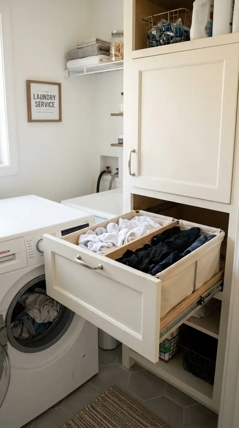 A pull-out hamper keeps dirty laundry concealed and saves floor space. Install a pull-out or tilt-out hamper inside a tall cabinet. Choose a hamper with two compartments for sorting lights and darks. Position the hamper directly beside or below the washer for easy loading. A narrow hamper can also fit between the washer and wall.