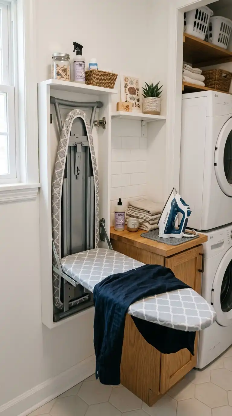 A wall-mounted, fold-down ironing board saves valuable floor space. Install it on a wall or inside a cabinet. When not in use, it folds flat against the wall. Some models include a built-in shelf for the iron. This is especially useful in tiny laundry rooms where a freestanding board would be impossible to accommodate.