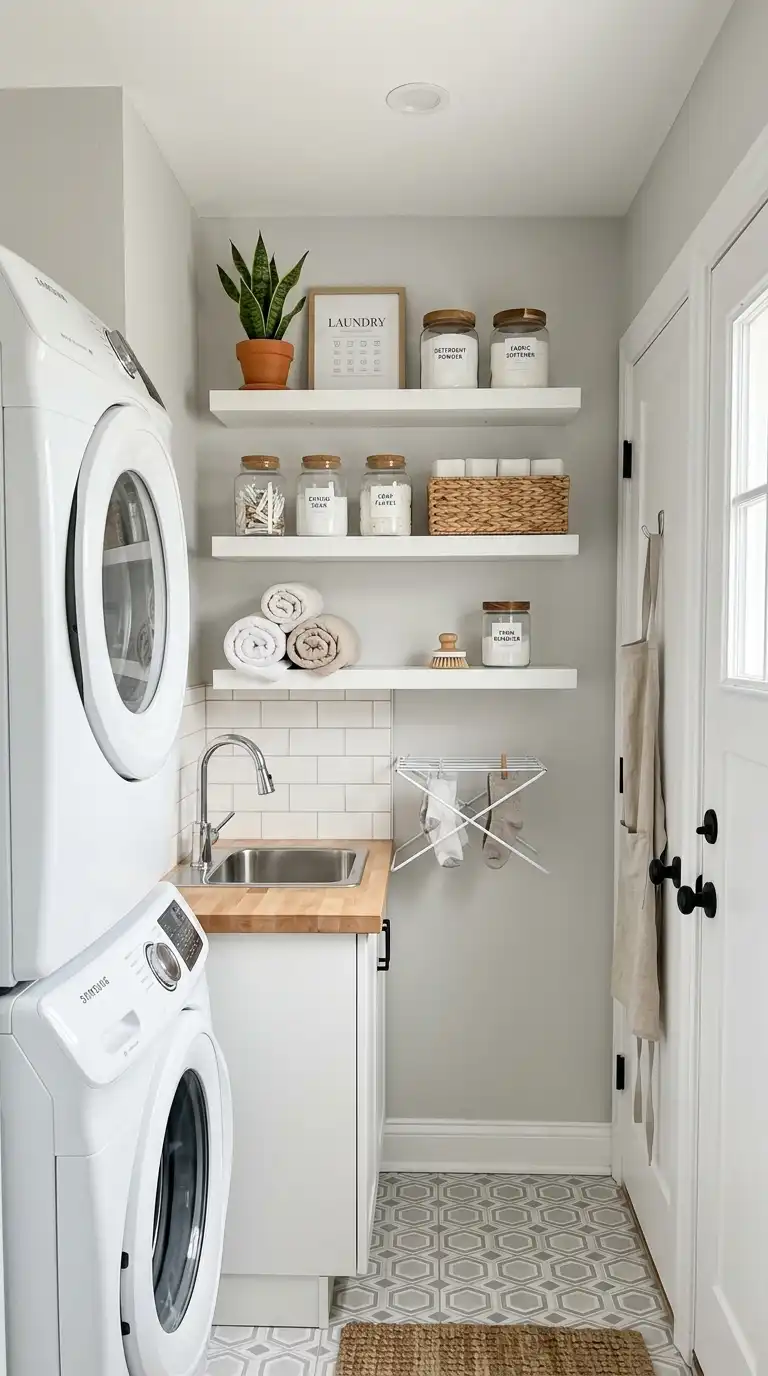 Open shelving can make a tiny laundry room feel less bulky than closed cabinets. Use floating shelves to store supplies in matching glass jars or baskets. The openness keeps the space feeling airy. However, open shelving requires keeping items neatly arranged since everything is visible. Use uniform containers for a cohesive look.