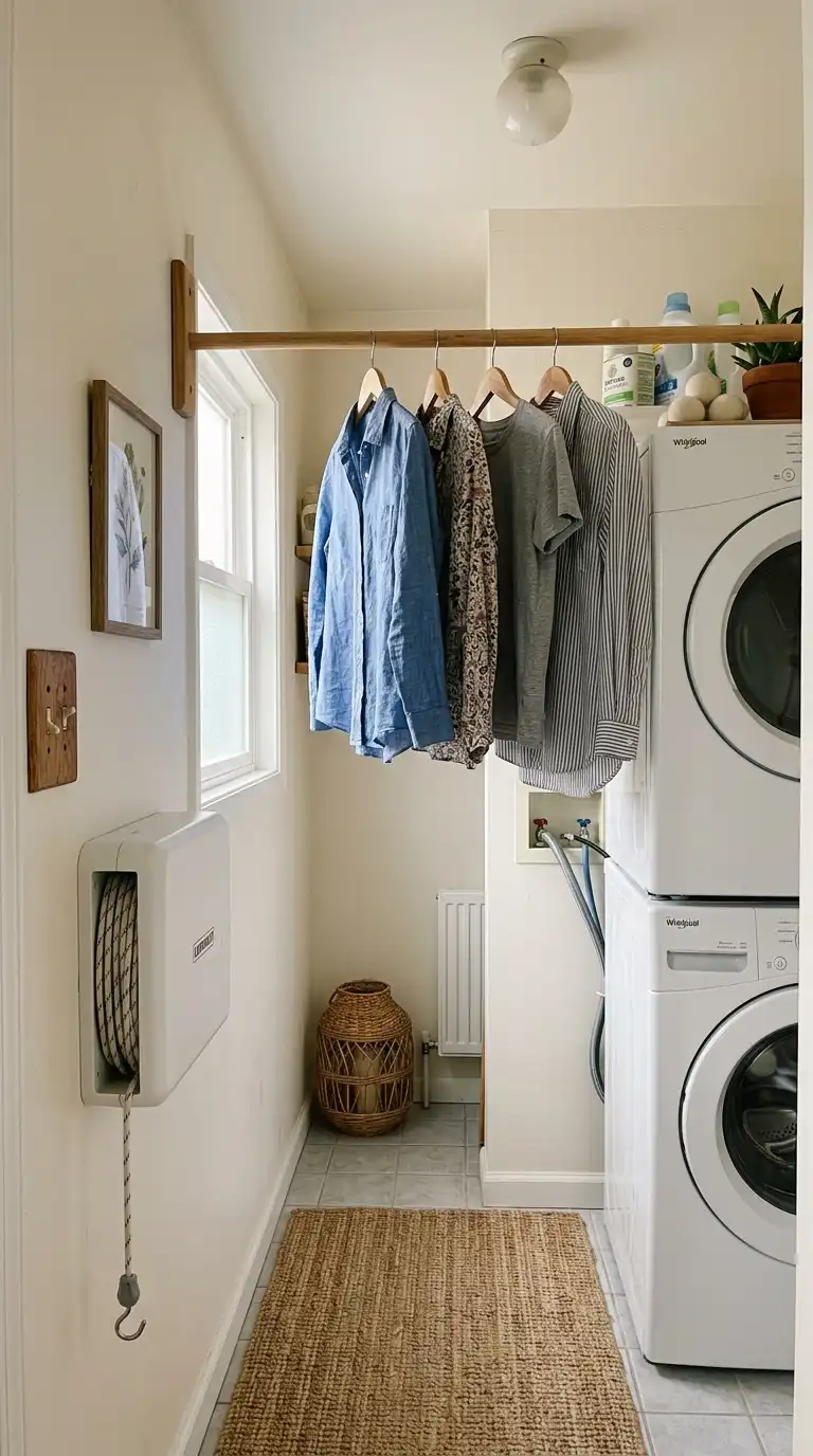 A hanging rod is useful for air-drying clothes or steaming freshly ironed shirts. Install a sturdy rod above the washer and dryer or along an empty wall. In a very tiny space, use a retractable rod that pulls out when needed and retracts when not in use. A wall-mounted rack with folding arms is another space-saving option.