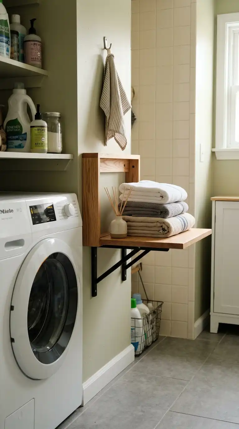 If you don’t have room for a full countertop, install a small fold-down shelf on the wall. The shelf folds flat when not in use and provides a temporary folding surface when needed. Use it for folding a few items at a time or as a place to set a laundry basket. This is an excellent solution for closet-sized laundry areas.