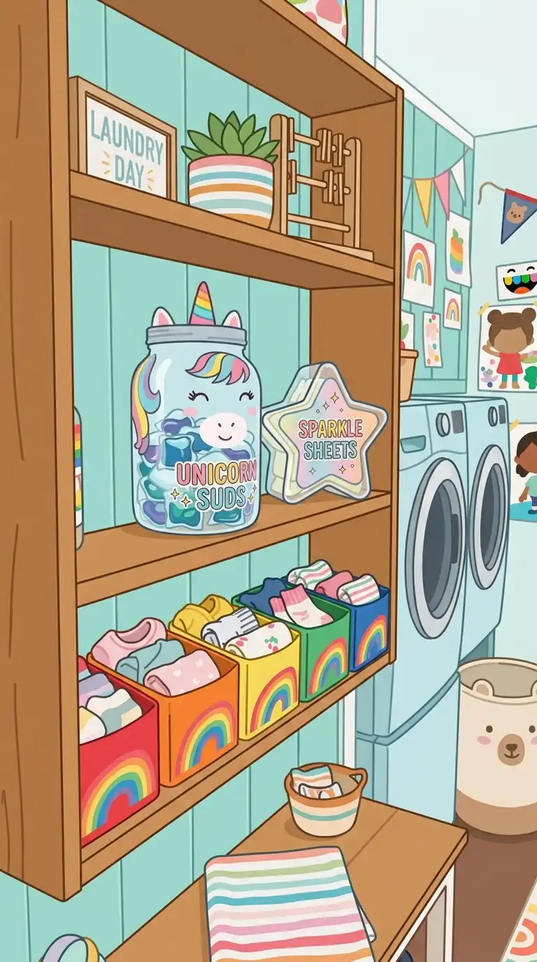 Replace upper cabinets with open shelves and use fun, whimsical storage containers. Use rainbow-colored bins, animal-shaped jars, or glittery boxes to hold detergent, dryer sheets, and clothespins. The open shelving keeps supplies visible and adds personality to the room. Mix and match colors and patterns freely.