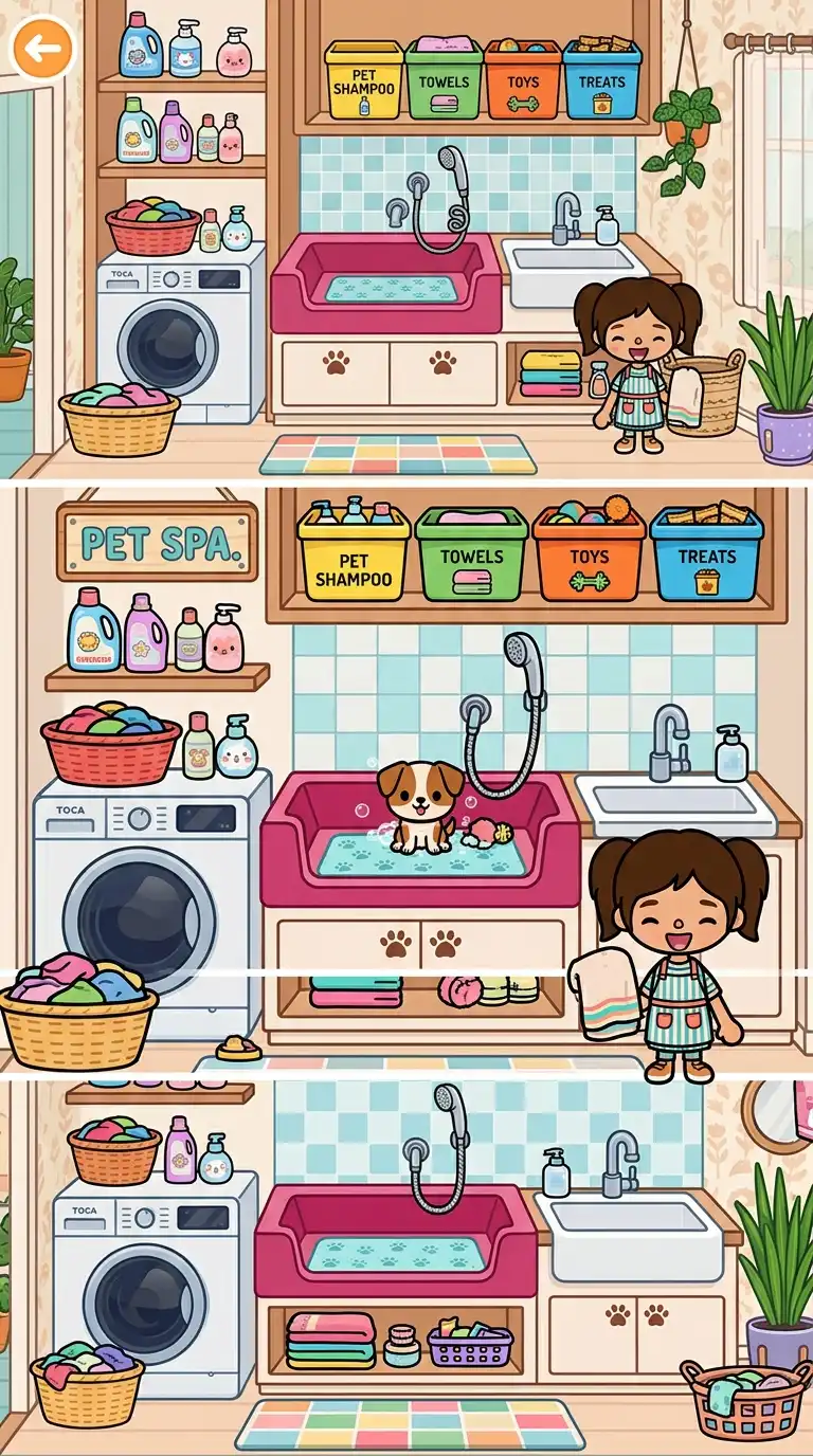If your Toca Boca family has pets, add a pet washing station to your laundry room. Use a deep basin with a handheld sprayer and a non-slip mat. Store pet shampoo, towels, and brushes in colorful bins nearby. Add a small sign that reads “Pet Spa.” This is a fun, interactive feature.