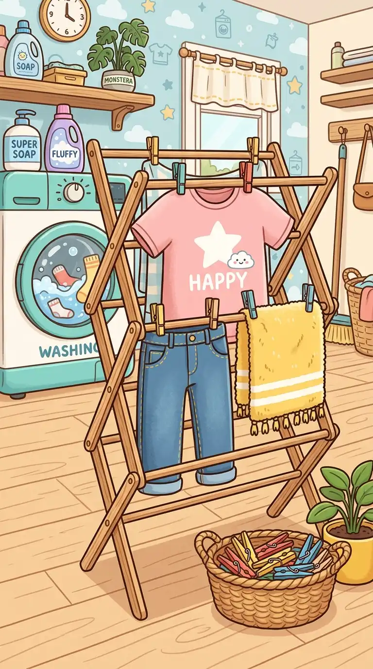 Add a wooden or metal drying rack to your laundry room, and populate it with hanging clothes. Use Toca Boca’s clothing items—shirts, pants, socks, and towels—to make the room feel lived-in. The drying rack adds realism and a cozy, domestic feel.