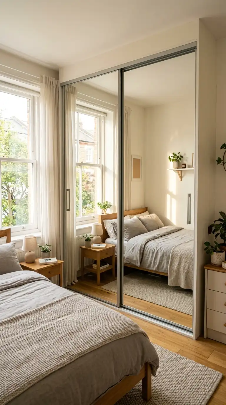 Full-height mirrored sliding doors are a classic choice for small bedrooms. The seamless reflective surface bounces light around the room, making the space feel larger and brighter. The mirrors also serve as a practical full-length dressing mirror, eliminating the need for a separate piece. Choose frameless mirrors for a clean, contemporary look, or add slim metal frames for architectural definition. The sliding mechanism saves floor space, making this design ideal for compact layouts.