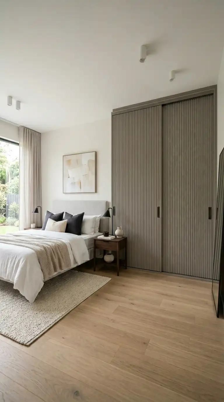 Fluted or ribbed panels add texture and architectural interest to sliding wardrobe doors. The vertical grooves create rhythm and depth, catching light and casting subtle shadows that change throughout the day. This detailing transforms a simple wardrobe into a design feature, adding visual richness without overwhelming the space. Choose a matte finish to emphasize the texture, and pair with integrated handles or a simple groove for opening. Fluted panels work beautifully in modern, transitional, and eclectic interiors.