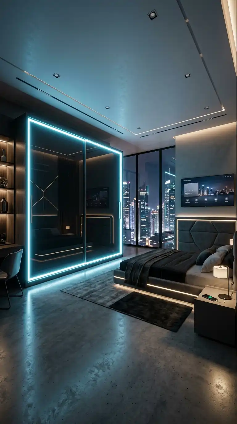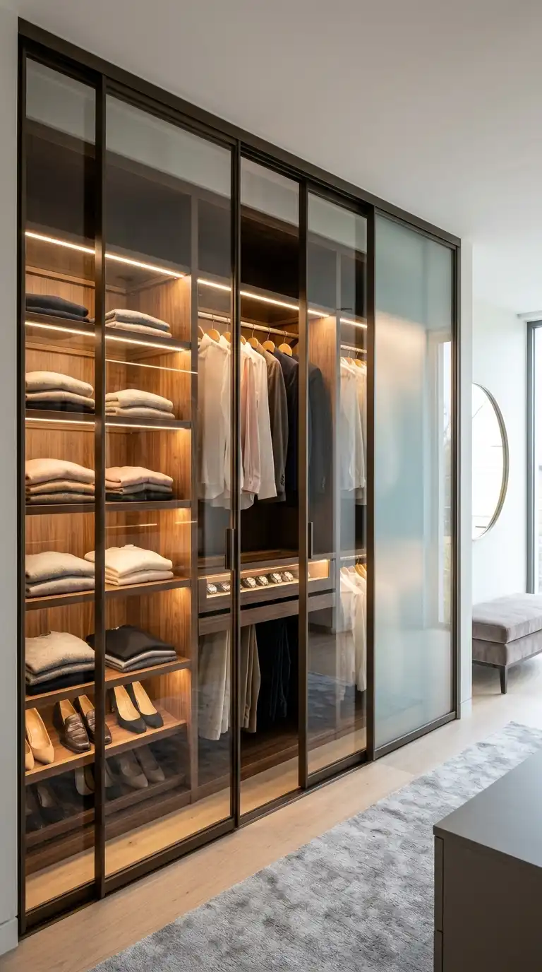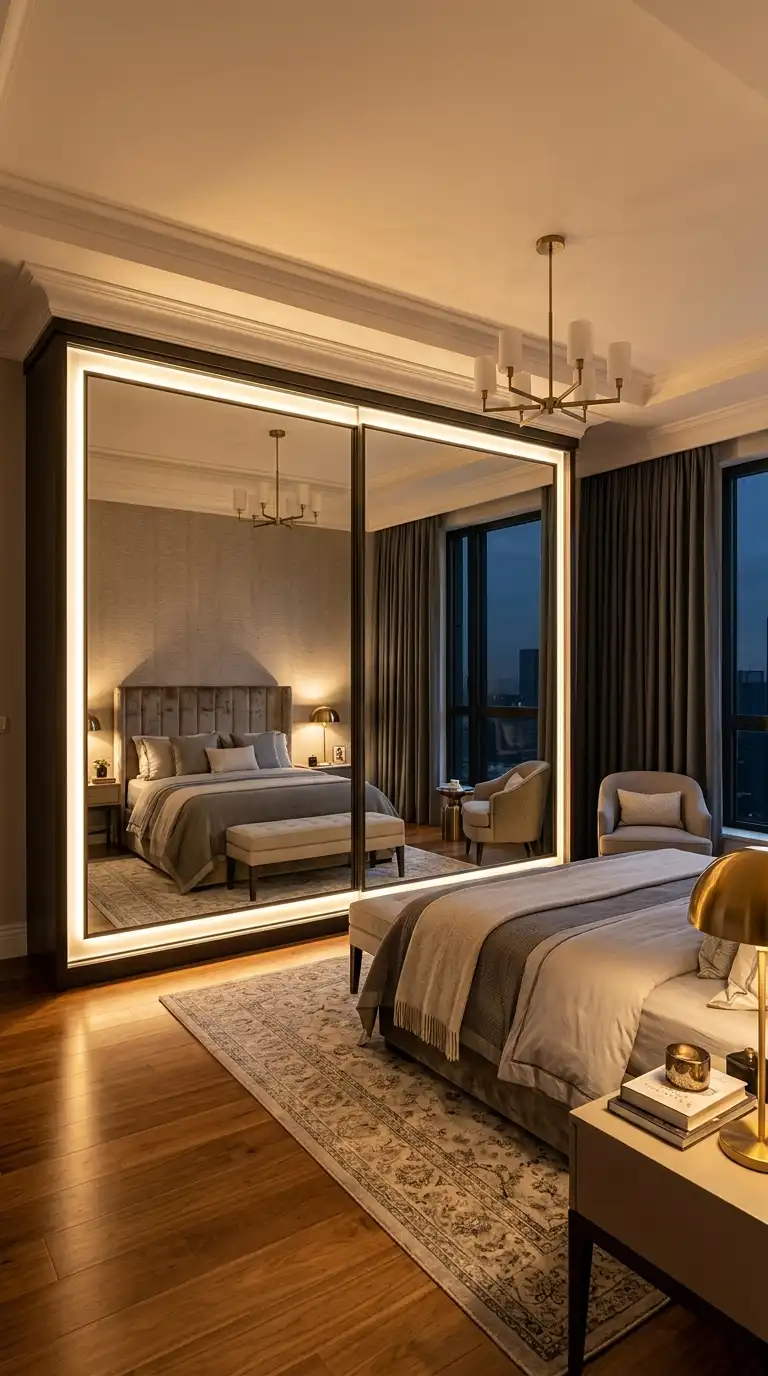 Combine the functionality of a mirror with the drama of backlighting. Install LED strips behind the mirror panels to create a soft, halo-like glow that adds sophistication and ambiance. The backlit mirror serves as a practical full-length mirror while also acting as a striking design feature, especially in evening settings. This design is perfect for master bedrooms and dressing rooms where a touch of glamour is desired.