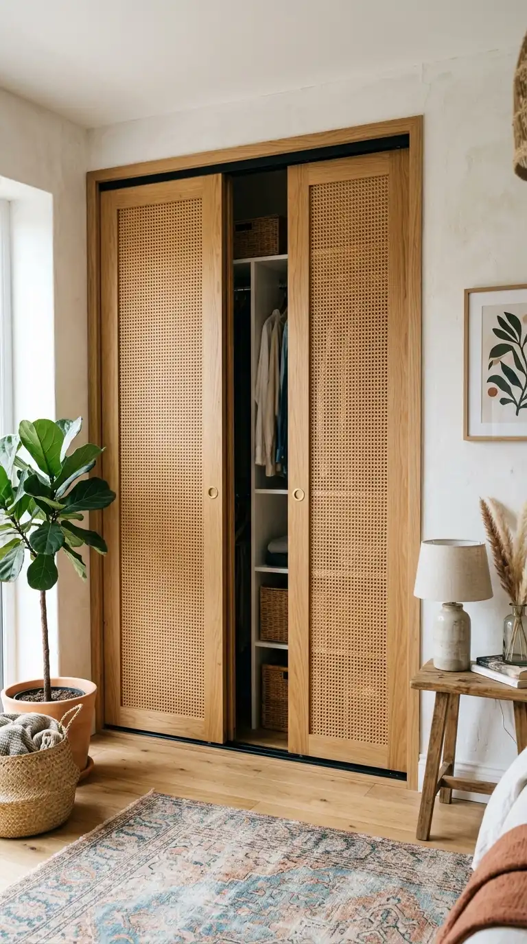For a touch of natural texture and boho charm, incorporate cane or rattan webbing into sliding doors. The natural material adds warmth and a handcrafted feel that softens the overall look of the wardrobe. Cane inserts work beautifully in bohemian, coastal, and eclectic interiors. Frame the cane with wood or metal for a finished appearance. The sliding mechanism ensures the doors remain functional while adding a unique design element.