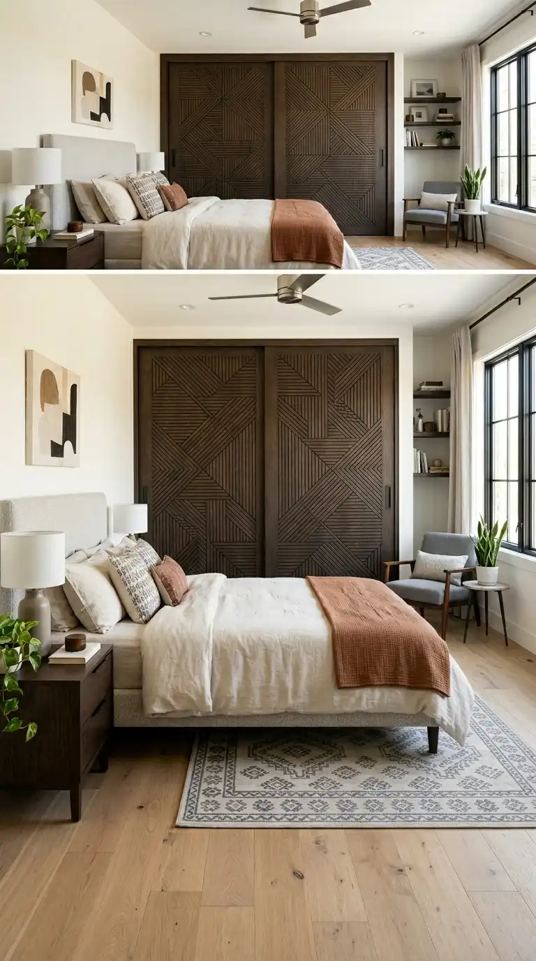 Add a modern twist with sliding doors featuring a geometric pattern. The pattern can be etched into the surface, created with applied overlays, or formed by contrasting materials. Geometric patterns add visual interest and can be customized to complement your bedroom decor. This design transforms the wardrobe into a work of art, perfect for contemporary and eclectic spaces.