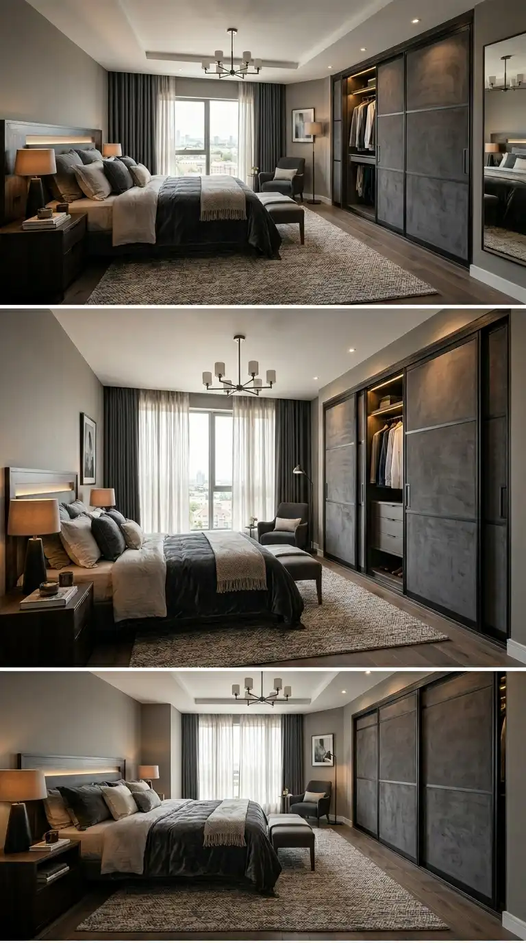 For a truly luxurious touch, incorporate leather or suede panels into sliding wardrobe doors. Soft, textured materials add warmth, sophistication, and a tactile element that contrasts beautifully with smooth surfaces. Use upholstered panels on the sliding doors, framed by metal or wood trim. This design works beautifully in master bedrooms and dressing rooms where luxury is a priority. The sliding mechanism maintains functionality while adding a high-end aesthetic.