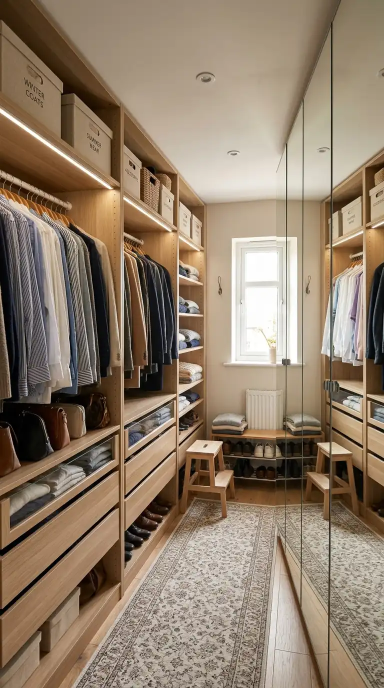 Categorize clothing by type and frequency of use. Place everyday essentials at eye level, use double hanging rods for shirts and trousers, and incorporate pull-out drawers for folded items. Use uniform hangers for a cohesive look, and store accessories in clear boxes or on dedicated racks. Regular edits keep the space functional and clutter-free. - What lighting is best for a walking wardrobe?