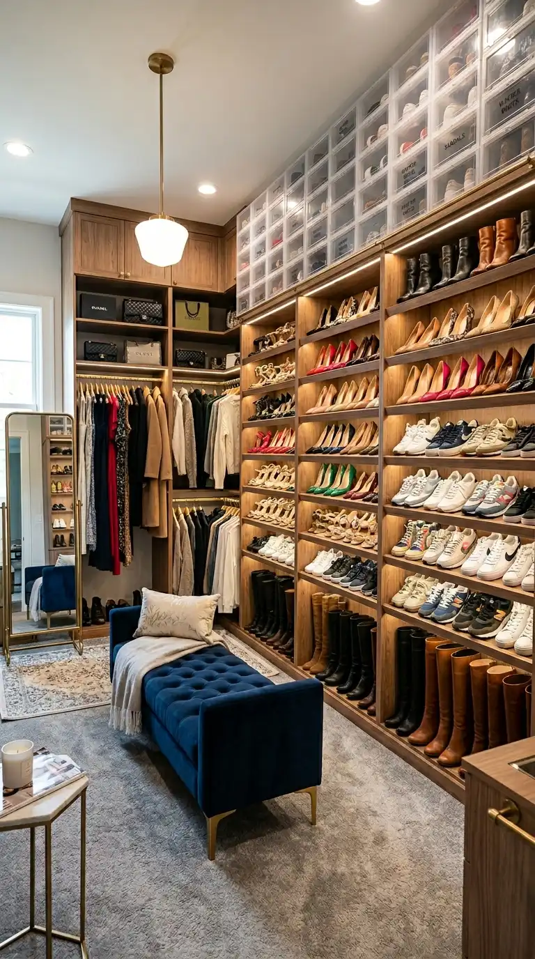 For shoe enthusiasts, a dedicated shoe wall is essential. Design floor-to-ceiling shelving angled to display shoes attractively, or use clear stackable boxes for protection while maintaining visibility. Consider incorporating a bench or seating area nearby to make trying on footwear comfortable. A shoe wall not only keeps your collection organized but also turns your footwear into a design feature. Organize shoes by color, style, or season for a visually appealing and functional display.