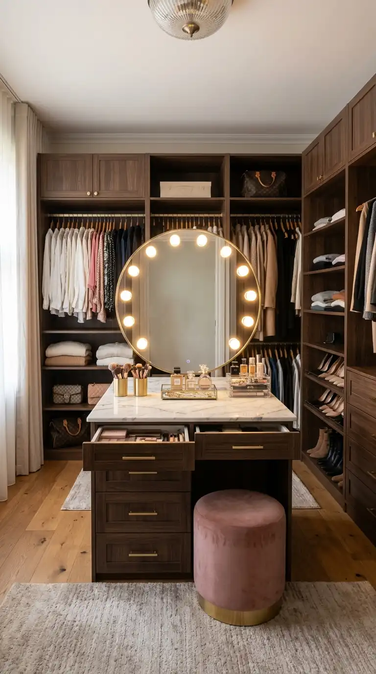 Incorporate a dressing table into your walking wardrobe for a complete grooming and dressing experience. Position the table near natural light if possible, or add a Hollywood-style mirror with built-in lighting. Include drawers for makeup, brushes, and accessories, and add a comfortable stool. This setup streamlines your routine, keeping all beauty and wardrobe essentials in one cohesive space. The dressing table can also serve as a jewelry station or a spot for laying out accessories.