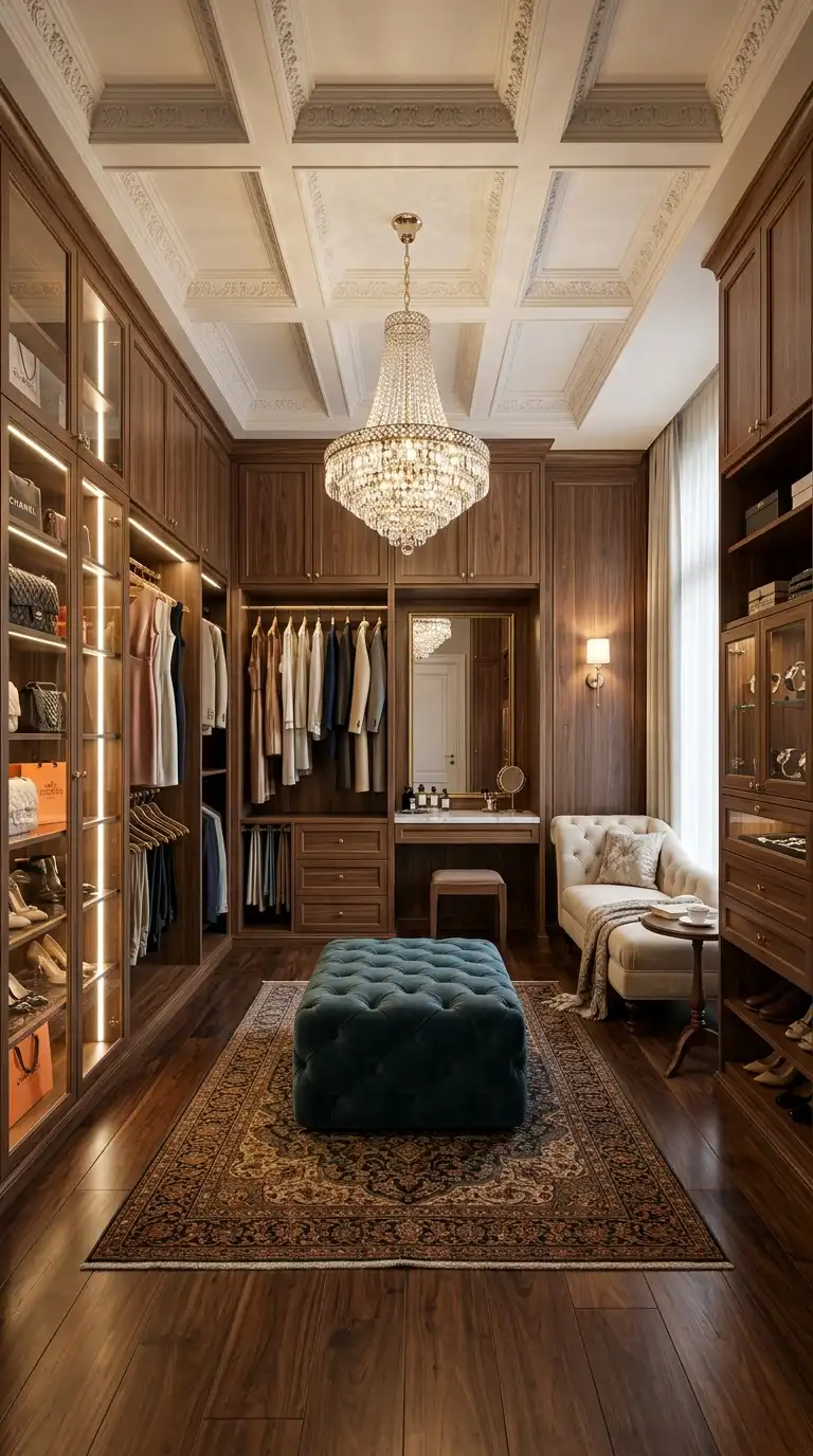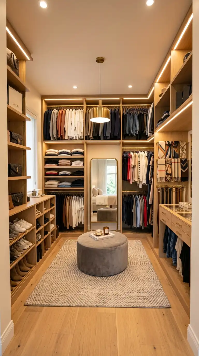 Layered lighting works best. Use recessed or track lighting for overall illumination, LED strip lighting inside cabinets and along shelves for visibility, and statement lighting—like a chandelier or pendant—for ambiance. Warm white lighting (2700K–3000K) creates a soft, inviting atmosphere and accurately represents clothing colors.