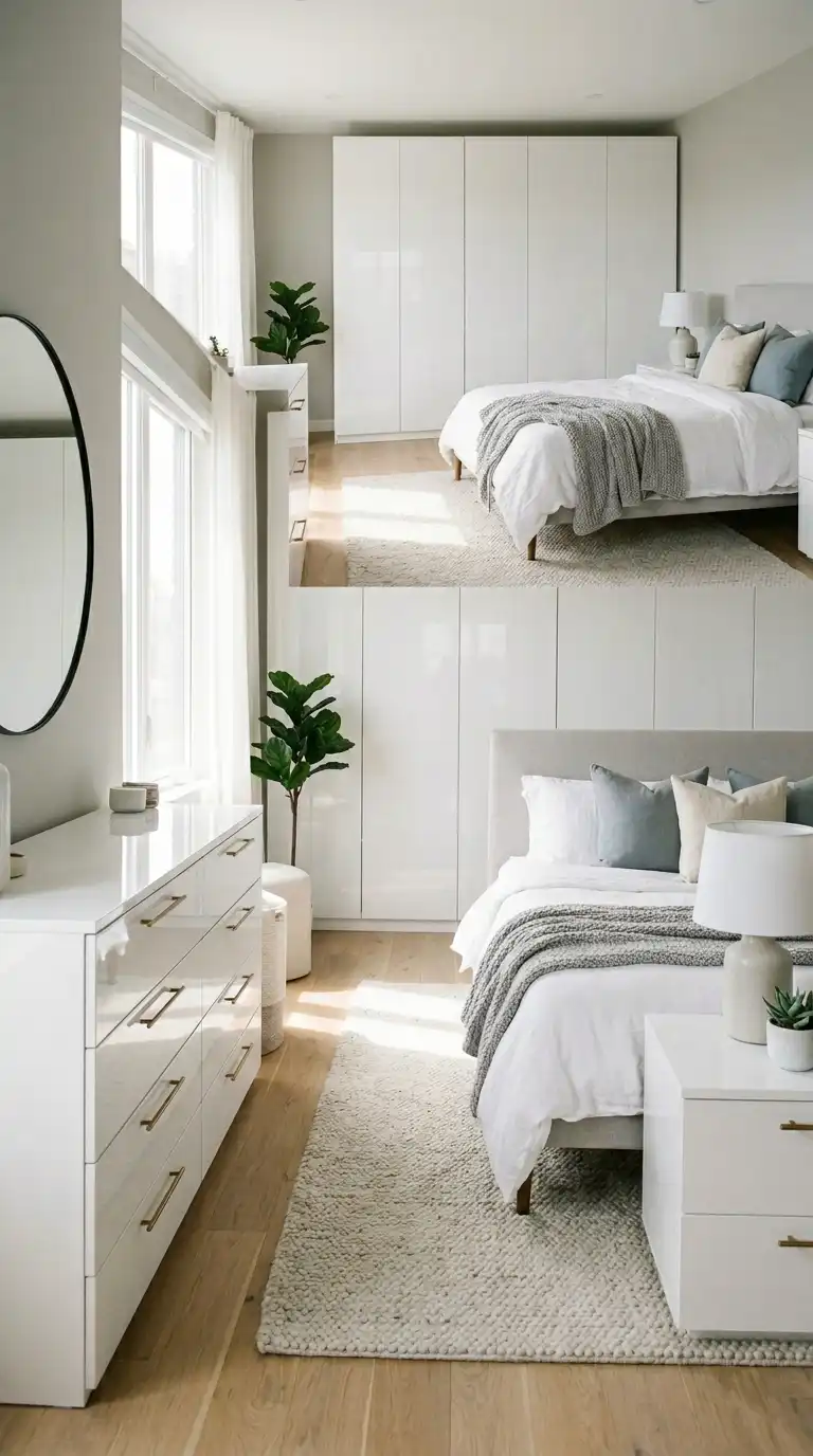 White high-gloss laminate is a timeless choice that brings a sense of modernity, cleanliness, and spaciousness to any bedroom. The reflective surface bounces light around the room, making even small spaces feel larger and brighter. This finish works beautifully with minimalist, contemporary, and Scandinavian interiors. Pair with slim metal handles in chrome or brass, or opt for a handleless push-to-open mechanism for a seamless, streamlined look. The glossy surface is easy to clean and resistant to moisture, making it a practical choice for bedrooms of all sizes.