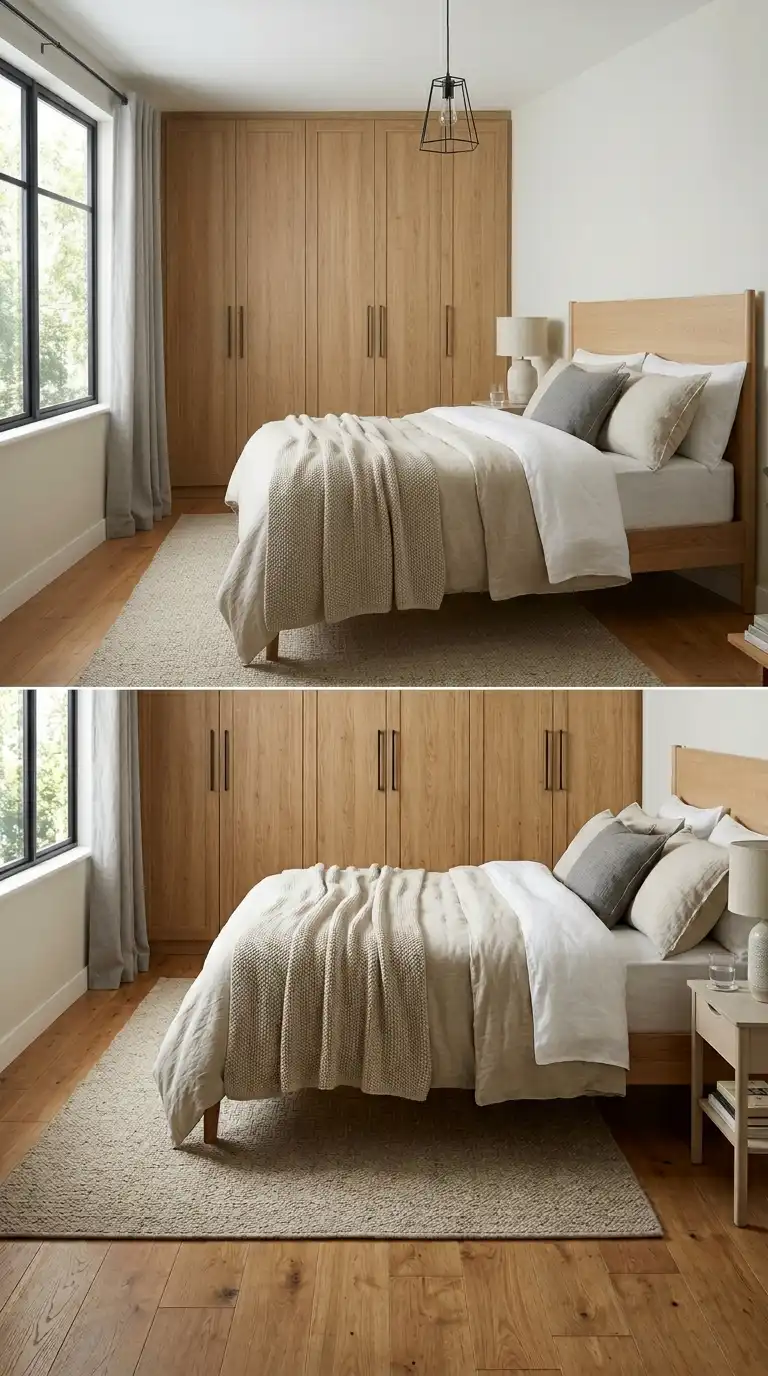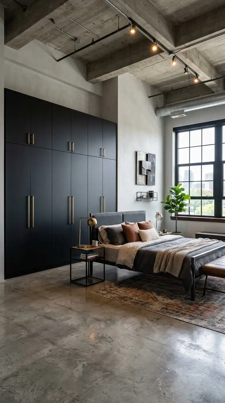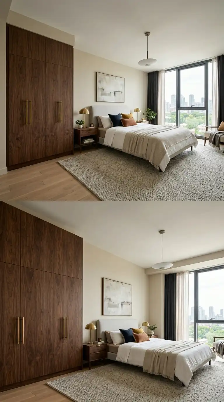 Matte black laminate makes a bold, dramatic statement in any bedroom. This finish exudes confidence, sophistication, and modern edge, perfect for industrial, contemporary, and minimalist interiors. The matte surface absorbs light, creating a moody, intimate atmosphere. Pair with black or brushed brass hardware for a cohesive look, or contrast with light walls and flooring to prevent the space from feeling too dark. Use matte black on full-height wardrobes or as an accent section within a larger laminate composition.