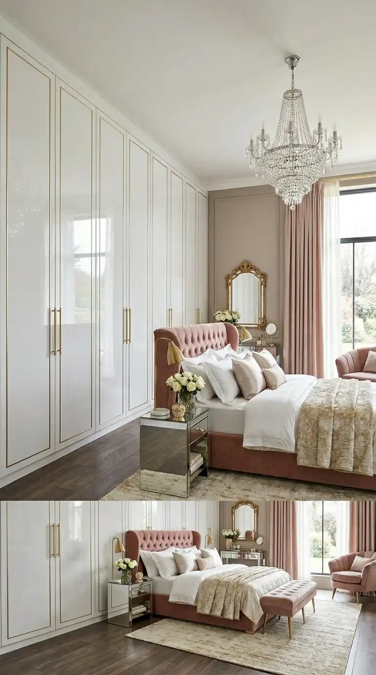 High-gloss white laminate paired with gold accents creates a luxurious, glamorous wardrobe design. The crisp white reflective surface brightens the space, while gold handles, trim, or inlays add warmth and elegance. This combination is perfect for contemporary, glam, and transitional bedrooms where a touch of luxury is desired. Use full-height glossy white doors with slim gold handles, or incorporate gold trim along door edges for a subtle yet sophisticated detail.