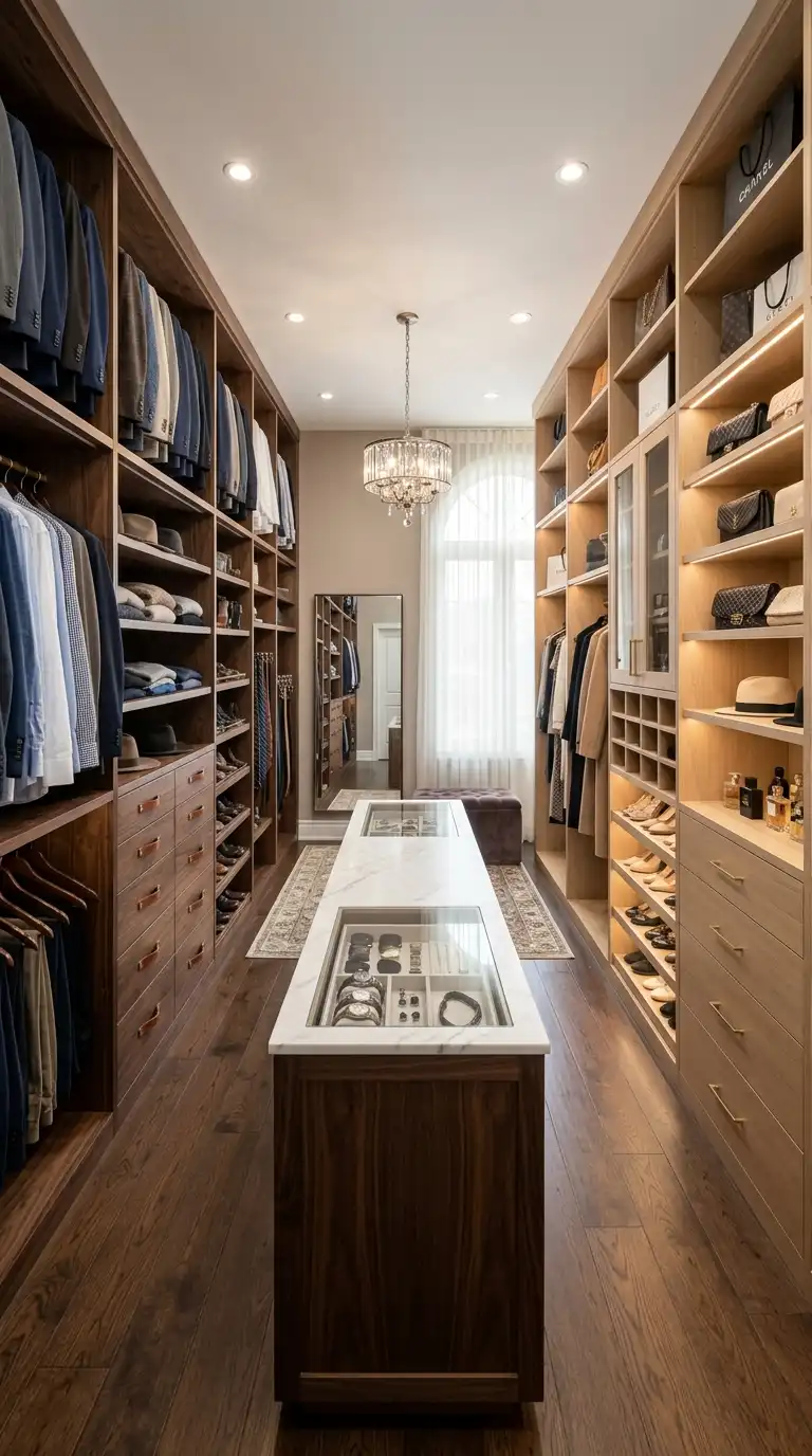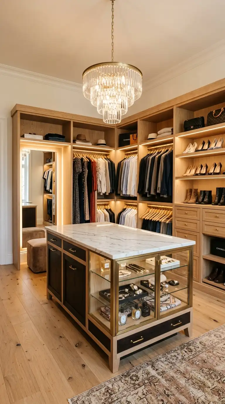 A boutique-style dressing room mimics the elegance and organization of a high-end clothing store. Key elements include a central island with glass-top display cases, floor-to-ceiling cabinetry, uniform hangers, and integrated LED lighting. Use warm, inviting lighting and a neutral color palette to create a luxurious atmosphere. A crystal chandelier adds the finishing touch.