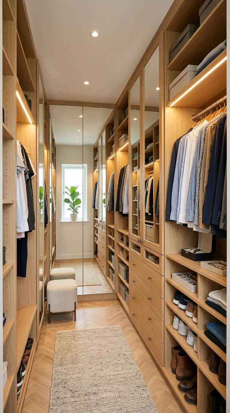Layered lighting works best. Use recessed or track lighting for overall illumination, LED strip lighting inside cabinets and along shelves for visibility, and statement lighting for ambiance. Warm white lighting (2700K–3000K) is flattering for clothing colors.