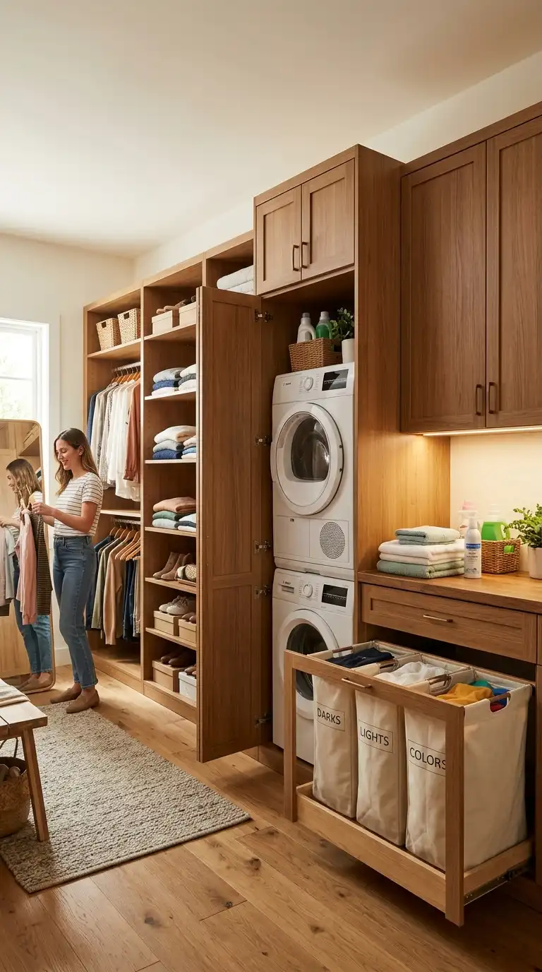 For ultimate convenience, integrate a laundry station into your dressing room. A small washer and dryer, a pull-out hamper, and a folding surface streamline the process from washing to storing. This setup is especially practical for busy households.